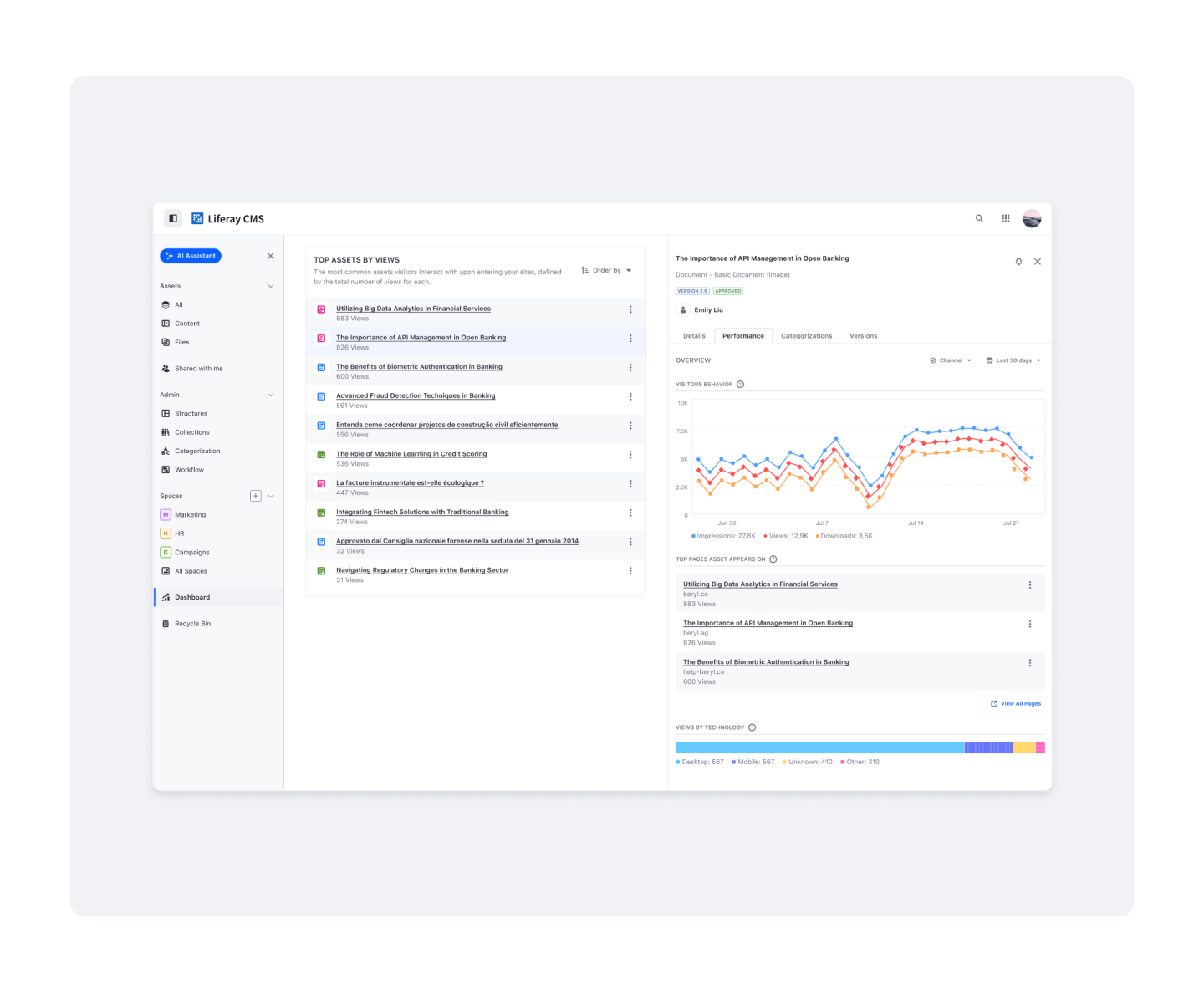 Fornisci informazioni dettagliate in tempo reale per monitorare le prestazioni dei contenuti, l'attività degli utenti e le metriche di conformità. Queste dashboard consentono ai team di prendere decisioni informate e ottimizzare la strategia dei contenuti in più sedi.