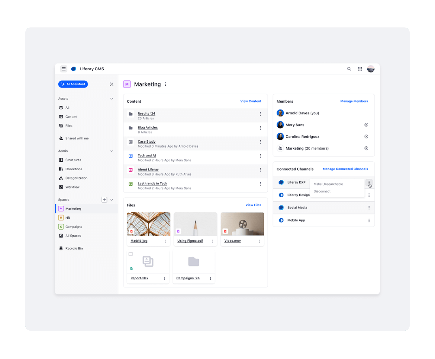 L'assistente IA semplifica la produzione di contenuti aiutando i team a redigere post per blog, articoli della knowledge base e layout di pagine strutturate. Disponibile nel Liferay Marketplace, l'assistente AI migliora la produttività automatizzando le attività di scrittura ripetitive e mantenendo i contenuti in linea con gli standard editoriali e del marchio.