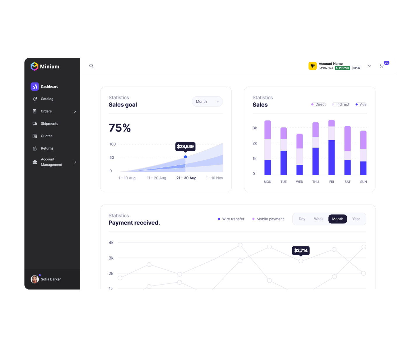 Simplifiez le traitement des commandes avec des devis, la gestion du crédit et des options de paiement hors ligne. Offrez aux utilisateurs métier des tableaux de bord administratifs personnalisables, avec suivi des KPIs en contexte, données de performance et une intégration fluide avec l'Analytics Cloud.
